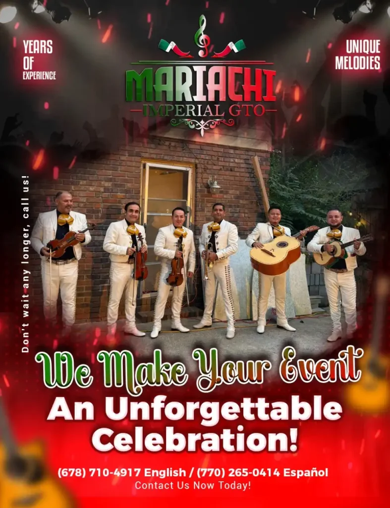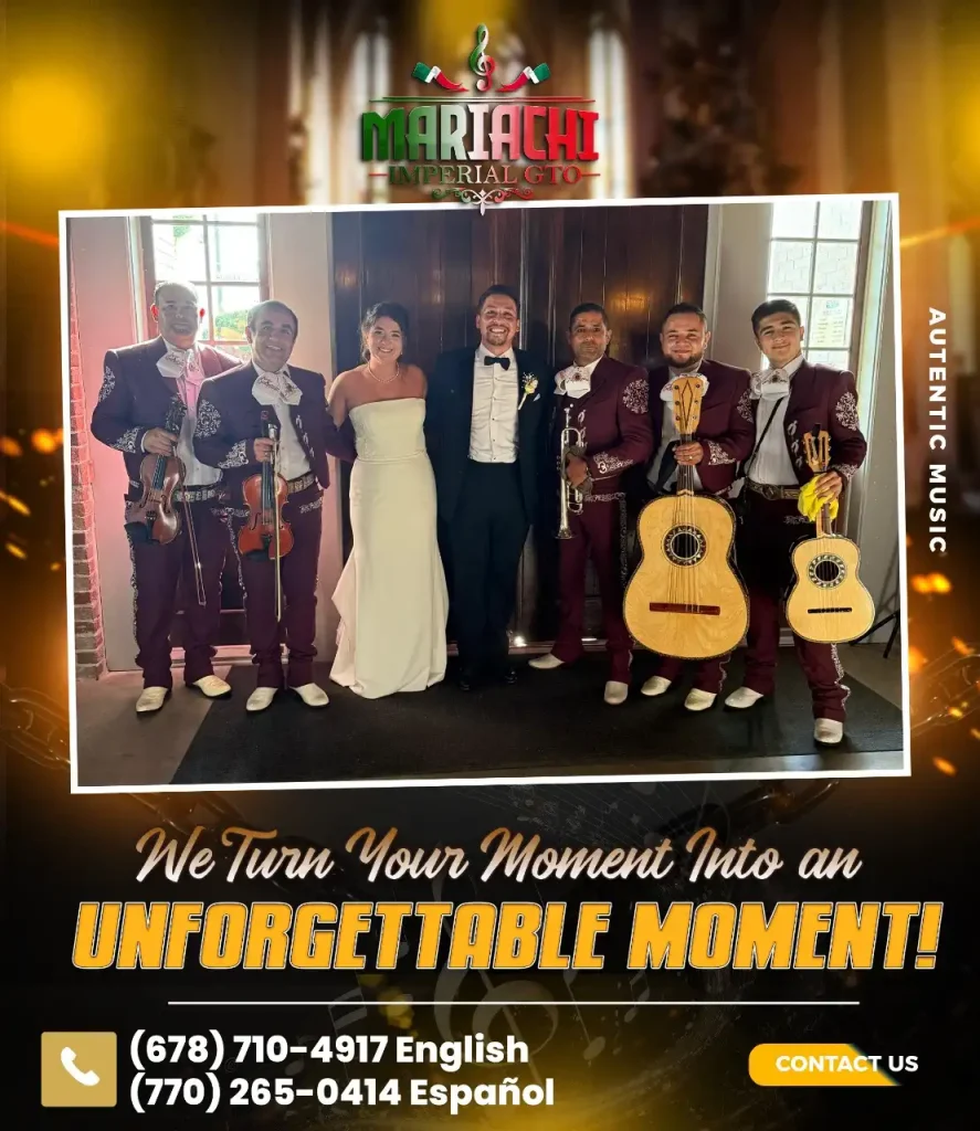At Mariachi Imperial GTO, we bring the authentic sound of Mexico to every celebration. With over 25 years of experience, our professional mariachi group delivers powerful, emotional, and unforgettable performances for weddings, quinceañeras, birthdays, serenades, masses, funerals, and corporate events. Available 24/7, we proudly serve Winder, GA, and offer free travel up to 150 miles. Every presentation is filled with passion, elegance, and the truly imperial mariachi sound that sets us apart.